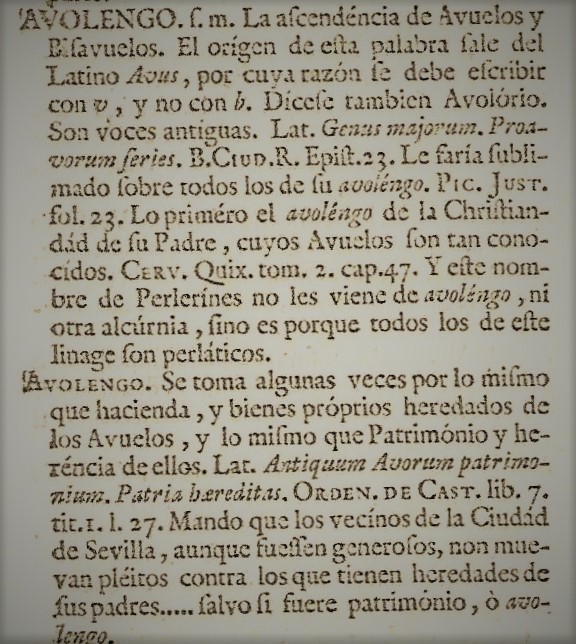 Fragmento de la página del volumen Primero del Primer Diccionario de la RAE, en el que se encuentra la palabra Avolengo (Abolengo)