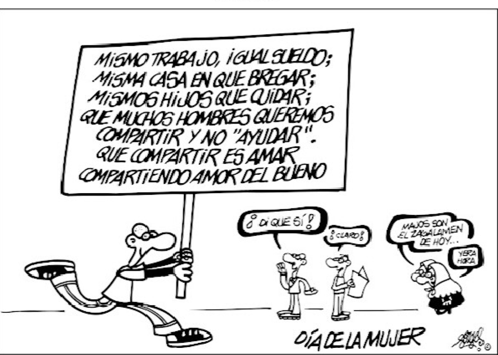 Recordando, sin entrar en profundidades, algunas lecturas de los inicios de la humanidad, me embarco en el libro del Génesis, en su capítulo 3. Una pareja: un hombre y una mujer ( o una mujer y un hombre) viven felices en el paraíso, o al menos eso nos hace imaginarnos la lectura. Tienen de todo, según parece, pero el mal acecha y busca la ocasión propicia y en forma de serpiente se acerca a la mujer y abre la duda. Ante el buen hacer y decir de la serpiente, la mujer, al final, tomó fruta del árbol prohibido y comió y le dió al hombre para que comiese. Y cuando el Creador observó el hecho, le dijo al hombre (no a la mujer sino al hombre): «¿Es que has comido del árbol de que te prohibí comer?» (repito, se lo dice al hombre no a la mujer) y el hombre, en su corta existencia (no en su corta inteligencia, si no en el poco tiempo que llevaba con vida) ve la ocasión de «echarle el muerto» a alguien. ¿A quien? Evidentemente solo existe la mujer a quien culpar: «¡ La mujer que me diste por compañera me dió de él y comí!» . Los expulsó el Creador de la buena vida y le dijo de todo, menos bonitos. Y la mujer, ya para empezar, se llevó la peor parte: «Multiplicaré los trabajos de tus preñeces. Parirás con dolor los hijos y buscarás con ardor a tu marido, que te dominará». El autor de la traducción de la Biblia que tengo entre manos, como quien no quiere la cosa, dice respecto a este momento: «En estas palabras de Dios a la mujer y al hombre resalta la diversa misión del uno y de la otra en la familia: La del hombre es ser jefe de ella y su mantenedor; la de la mujer, cumplir el ansiado oficio de la maternidad». [En otros tiempos, hace mucho, mucho tiempo, este atrevido resumen del primer momento de la vida de la humanidad, podría haberme traído un calor abrasador de la hoguera hecha para estas ocasiones o, al menos, un estiramiento de músculos en las «modernas instalaciones» que en «climatizados lugares» disponía la «Santa» Inquisición. Ahora, gracias a Dios y a muchos hombres y mujeres ( a pesar de algunos hombres), esto no pasa de ser un torpe chascarrillo sobre la existencia del hombre (y de la mujer, aunque cuando digo hombre estoy hablando del ser humano) sobre la tierra.