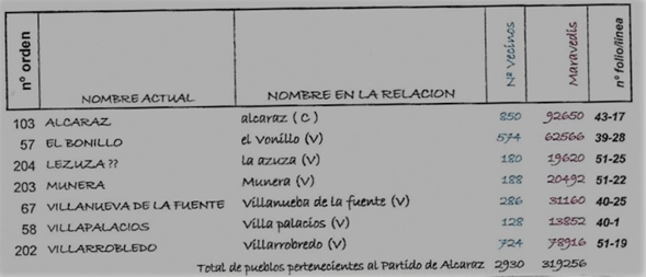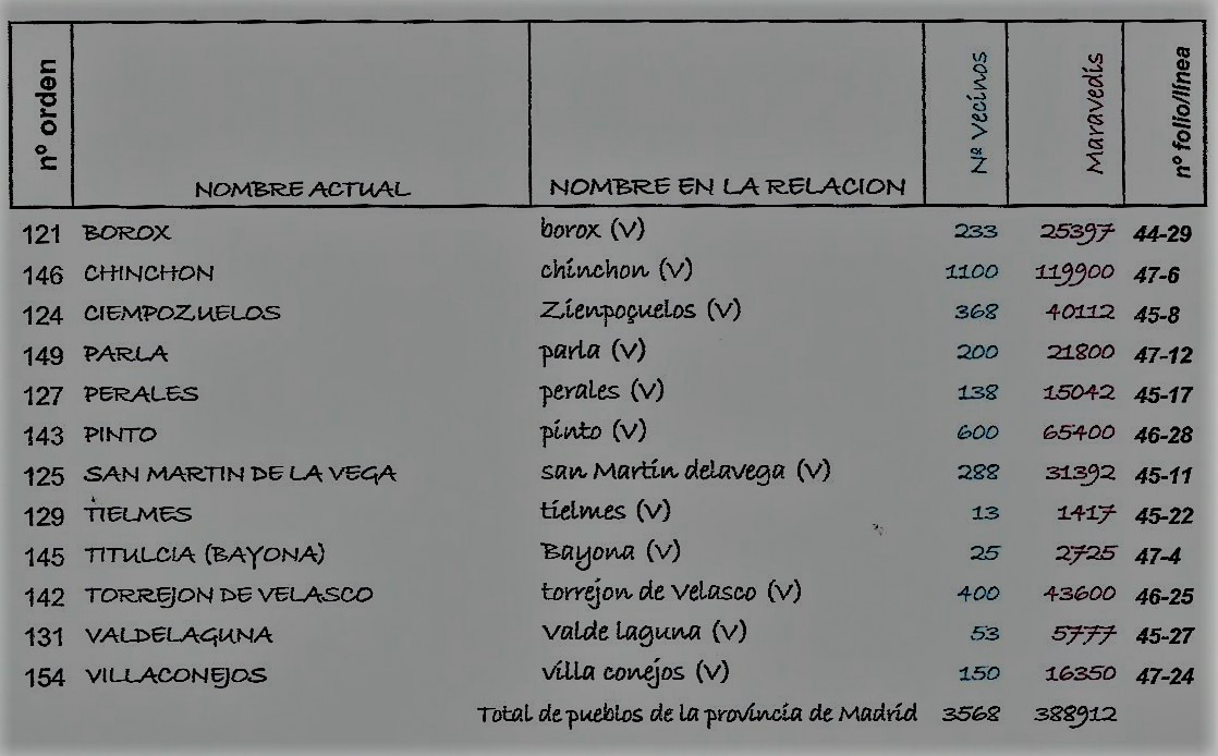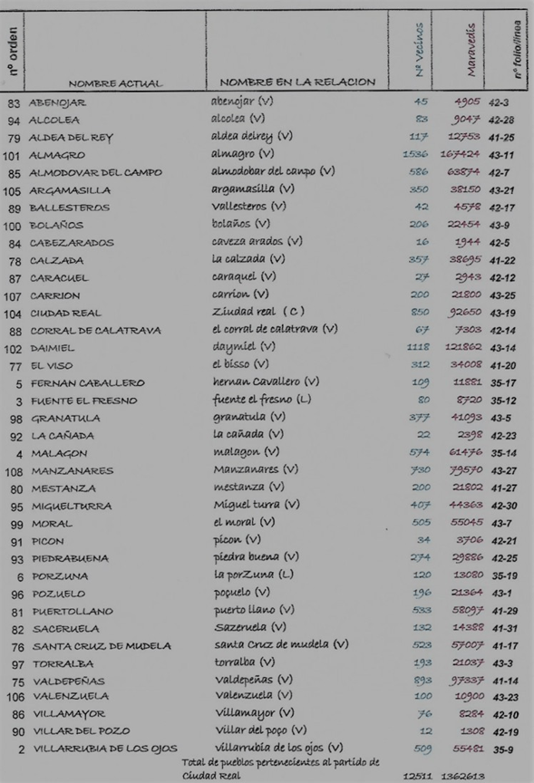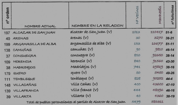 El total de pueblos sobre los que se repartió el gasto fué de 257, pertenecientes a los partidos de Ocaña (30 pueblos y 11.507 vecinos), Toledo (49 pueblos y 12.539 vecinos), Ciudad Real (38 pueblos y 12.511 vecinos), Infantes (21 pueblos y 5.073 vecinos), Alcaraz (7 pueblos y 2.930 vecinos) Priorato de San Juan (12 pueblos y 5.479 vecinos), Madrid (12 pueblos y 3.568 vecinos) y San Clemente, Huete y Cuenca (80 pueblos y 14.834 vecinos). Es decir una población total entre 239.000 y 273.000 habitantes, con un coste total por vecino de 108,055 maravedís.