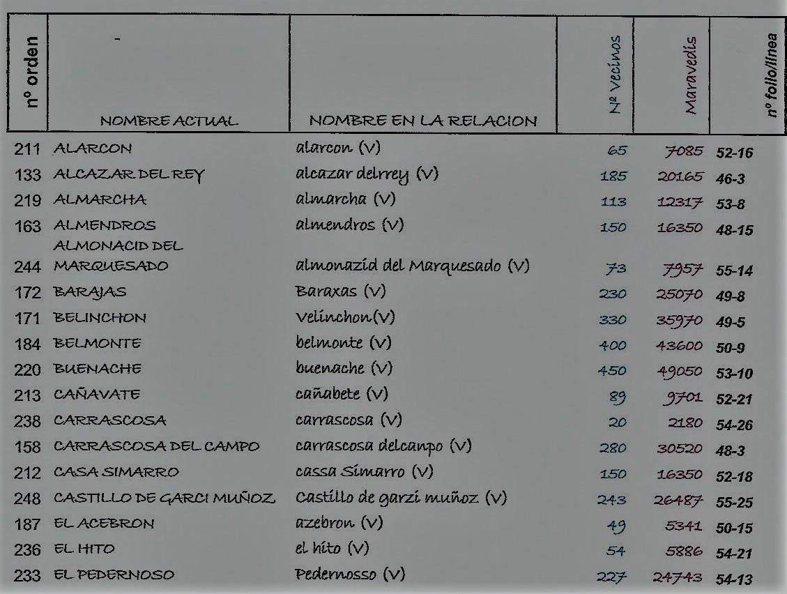 El total de pueblos sobre los que se repartió el gasto fué de 257, pertenecientes a los partidos de Ocaña (30 pueblos y 11.507 vecinos), Toledo (49 pueblos y 12.539 vecinos), Ciudad Real (38 pueblos y 12.511 vecinos), Infantes (21 pueblos y 5.073 vecinos), Alcaraz (7 pueblos y 2.930 vecinos) Priorato de San Juan (12 pueblos y 5.479 vecinos), Madrid (12 pueblos y 3.568 vecinos) y San Clemente, Huete y Cuenca (80 pueblos y 14.834 vecinos). Es decir una población total entre 239.000 y 273.000 habitantes, con un coste total por vecino de 108,055 maravedís.