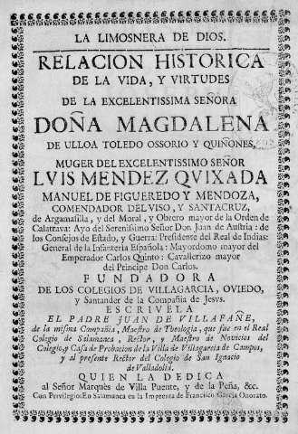 Portada del libro sobre la vida de Dª Magdalena de Ulloa y Toledo ( Fuente: Biblioteca Digital de Castilla y León)