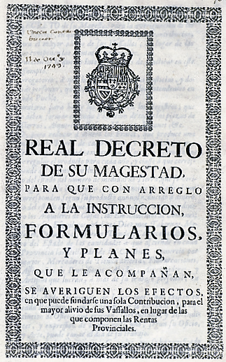 En efecto, en el año 1749, Zenón de Somodevilla, Marqués de la Ensenada, presentó un proyecto al rey Fernando VI para el establecimiento de un solo sistema de Contribución que el rey publico como Real Decreto que dio lugar al llamado Catastro del Marqués de la Ensenada, encaminado al establecimiento de la Contribución Única que sustituyese a las antiguas rentas provinciales. El rey Fernando VI, iniciaba así su decreto: