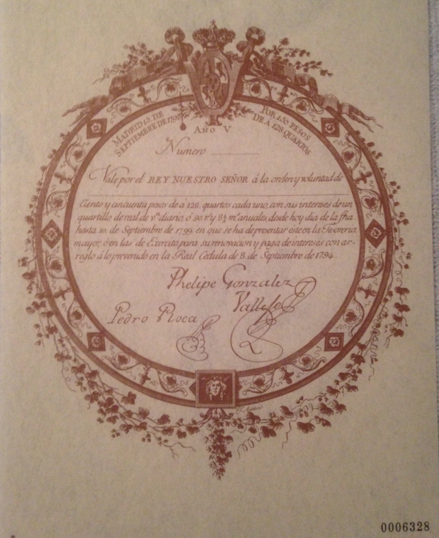 El vale Real de la figura anterior dice: » Madrid 15 de septiembre de 1794. Por 150 pesos de a 128 quartos. Vale por el rey Nuestro Señor a la orden y voluntad de ——————————– ciento y cincuenta pesos de a 128 quartos cada uno con los intereses de un quartillo de real diario o 90 reales y 8 mavavedies anuales desde hoy dia de la fecha hasta el 10 de septiembre de 1799 en que se ha de presentar este en la Tesoreria Mayor o en las de Exercito para su renovación y paga de intereses con arreglo a lo previsto en la Real Cédula de 8 de septiembre de 1794. Phelipe González Vallejo y Pedro Roca. [El indicado Phelipe González Vallejo , fallecido el 10 de enero de 1824, fue alto funcionario en distitntos departamentos del Consejo de Estado, siendo nombrado ministro de Hacienda en sustitución de Juan Pérez Villamil en 1815 ]