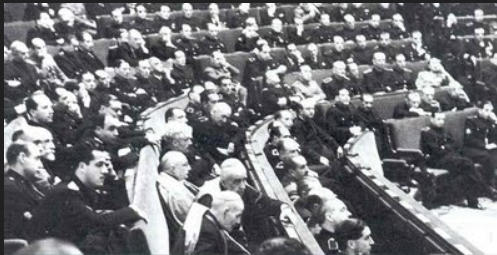 Sesión de Cortes Generales durante los primeros años del franquismo. En primer plano jerarquías de la Iglesia Católica.