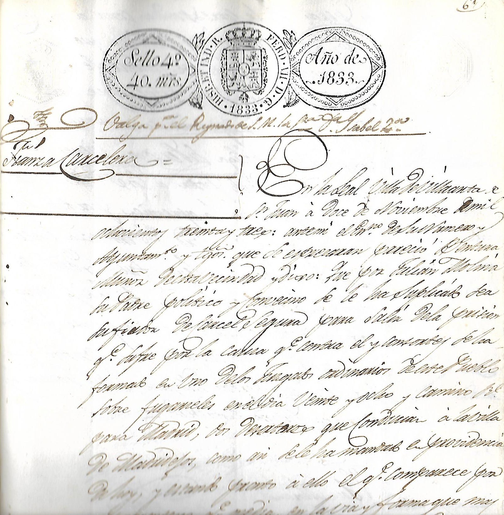 Fianza carcelera solicitada por Ventura Muñoz [Fuente: Protocolos de Instrumentos otorgados ante el escribano Joaquín García Morato. Leal Villaarta Año 1833]