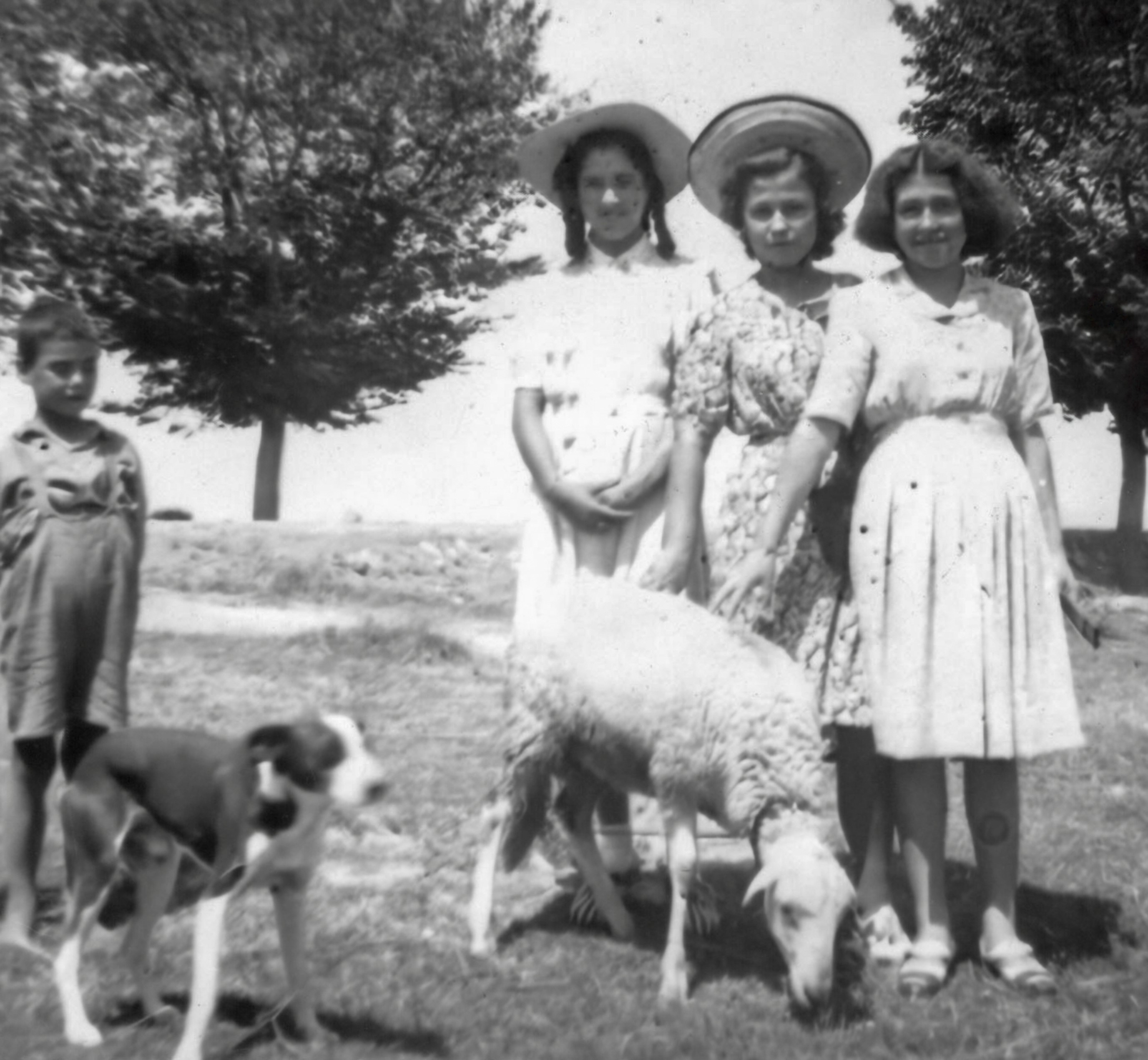 1958. En la Granja. De izquierda a derecha: Auren, Angel Arias, el perro Pipo, Laura Serrano, Laurita Arias y Benita.