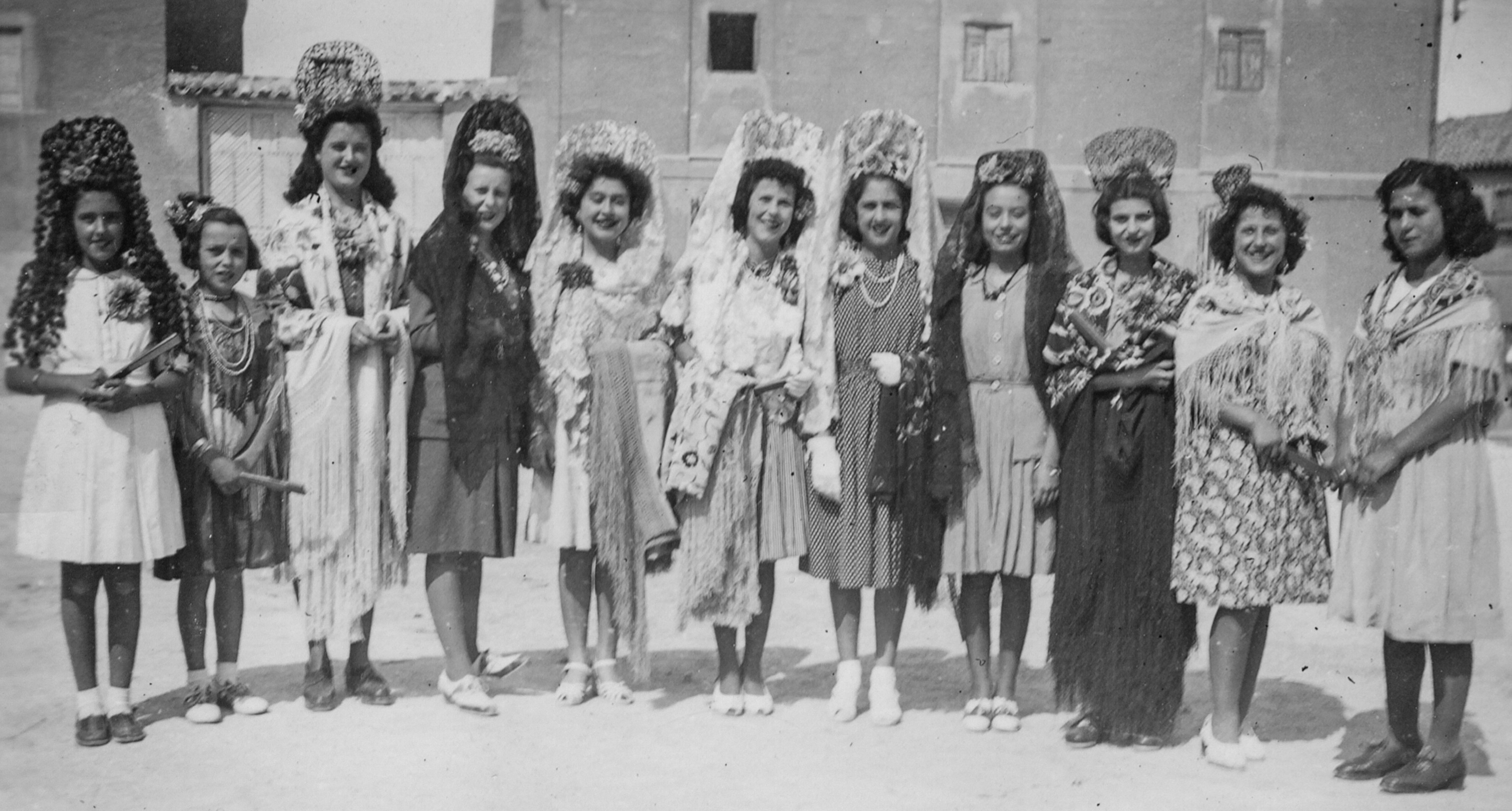 1944. Amigas caminos de los toros. De izquierda a derecha: Lolita Isla, Martina Calcerrada, Angelita Roncero, Adela Menchero, Luisita Serrano, Olimpia Moreno, Laurita Serrano, Natividad Garrido, Felicidad Sánchez, Consuelo Moreno y Valeriana.