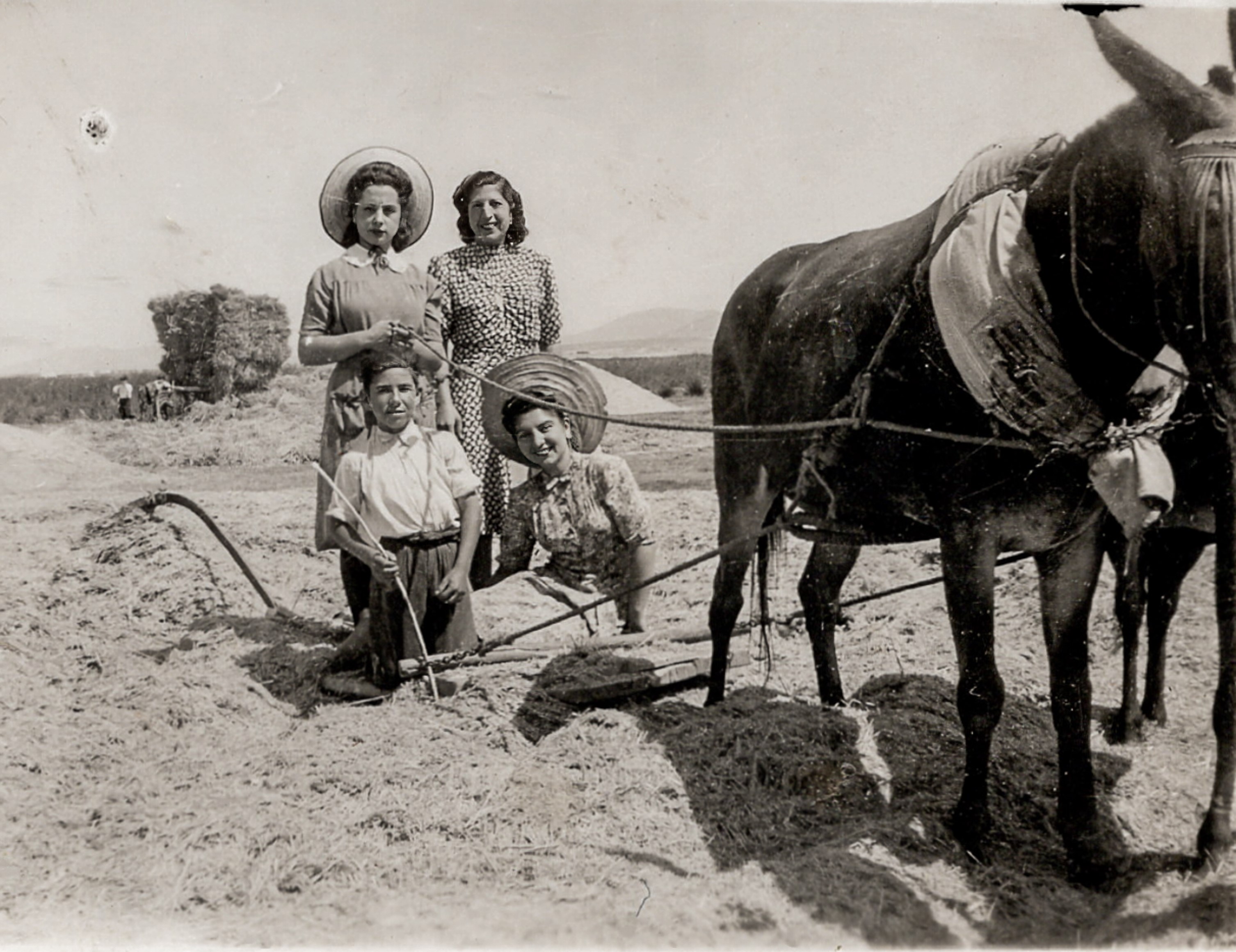 1944. Amigas en una trilla. De izquierda a derecha: Tere Guzmán,Rosario Serrano y Angelita Perales (No se indica el nombre del «trillaor», pero puede que alguien si lo sepa)
