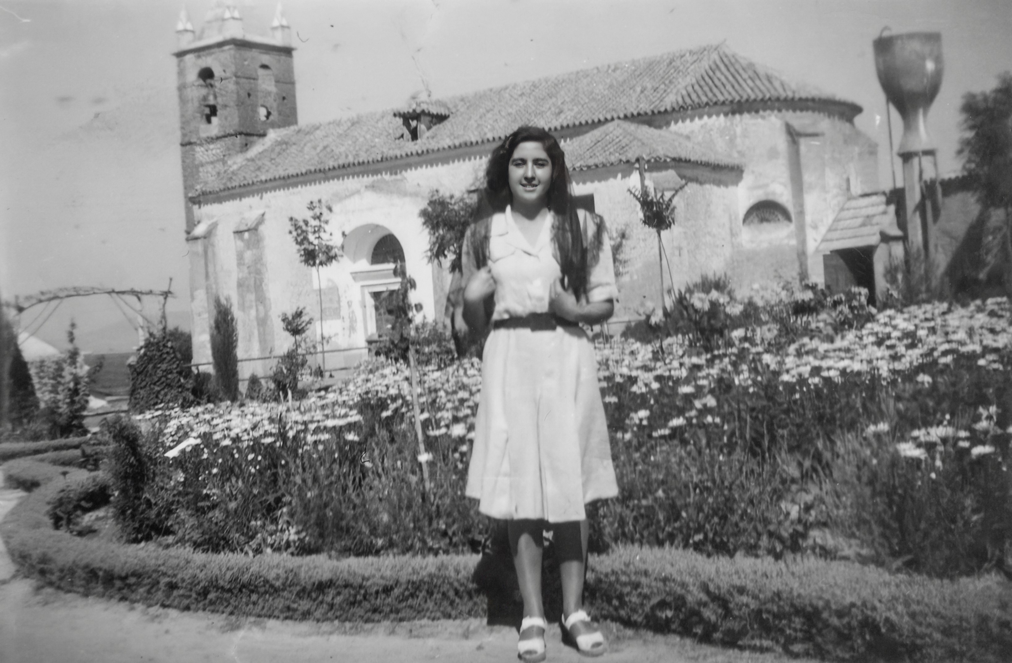 1946. Laurita Serrano saliendo de Misa en la Iglesia Vieja. [Teníamos ganas de ver alguna foto de la Iglesia tal y como estaba después de la Guerra. Es del año 1946, aún se estaban arreglando desperfectos. Se nota la falta de una campana. En el tejado se adivina la entrada de una pequeña buhardilla o piquera, -suponemos que para tener fácil acceso a la bóveda de la iglesia-, desaparecida desde hace muchos años. La puerta de entrada, aunque sencilla, conserva la forma de un antiguo gótico popular que hemos ido cargándonos, poco a poco, pero al menos hemos recuperado su imagen. Aspecto de la antigua glorieta o parquecillo inaugurado en aquellas fechas sobre el terreno compró a la Iglesia (antiguo y primer cementerio)