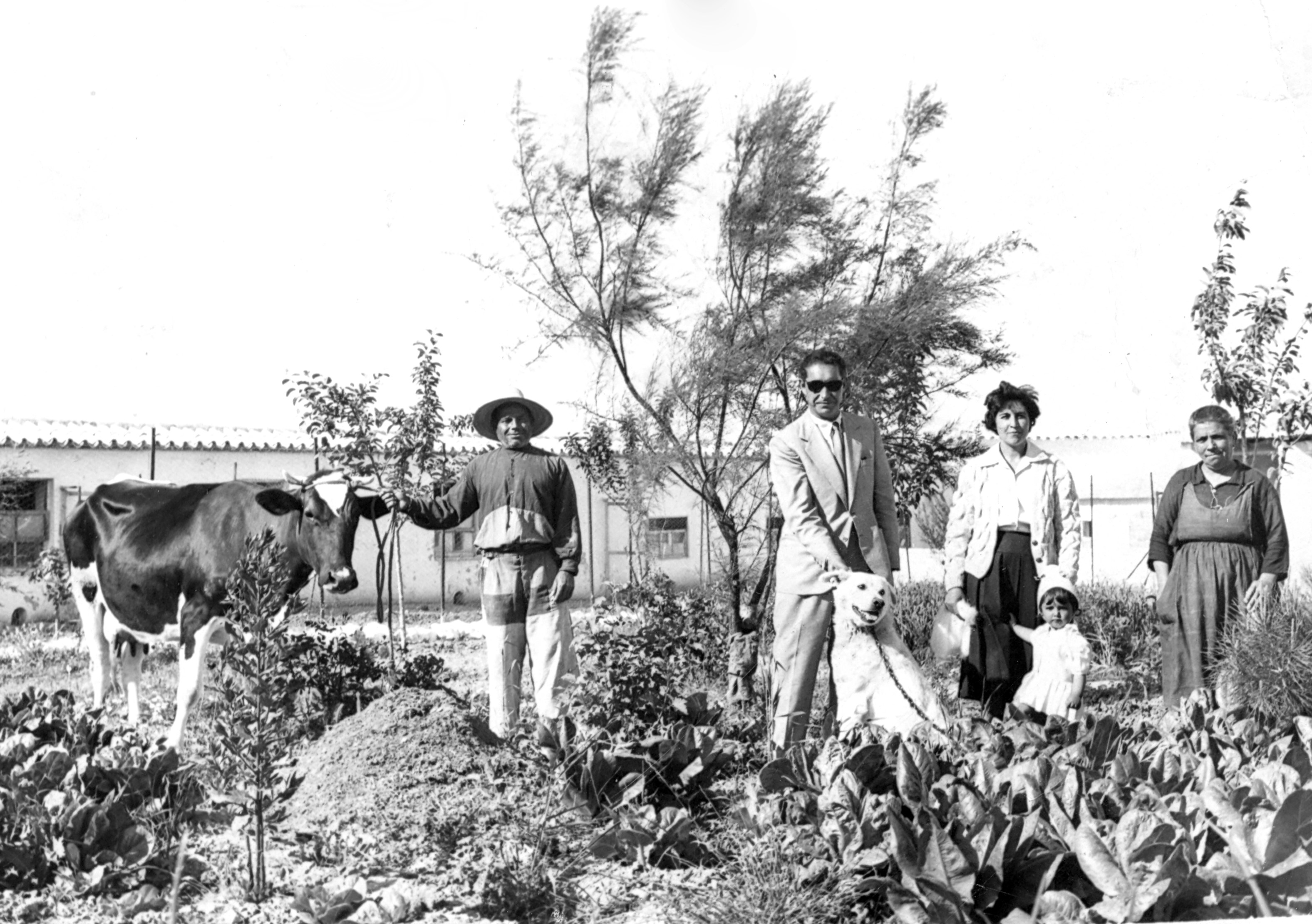 1958. En la Granja. De izquierda a derecha: Auren, Angel Arias, el perro Pipo, Laura Serrano, Laurita Arias y Benita.