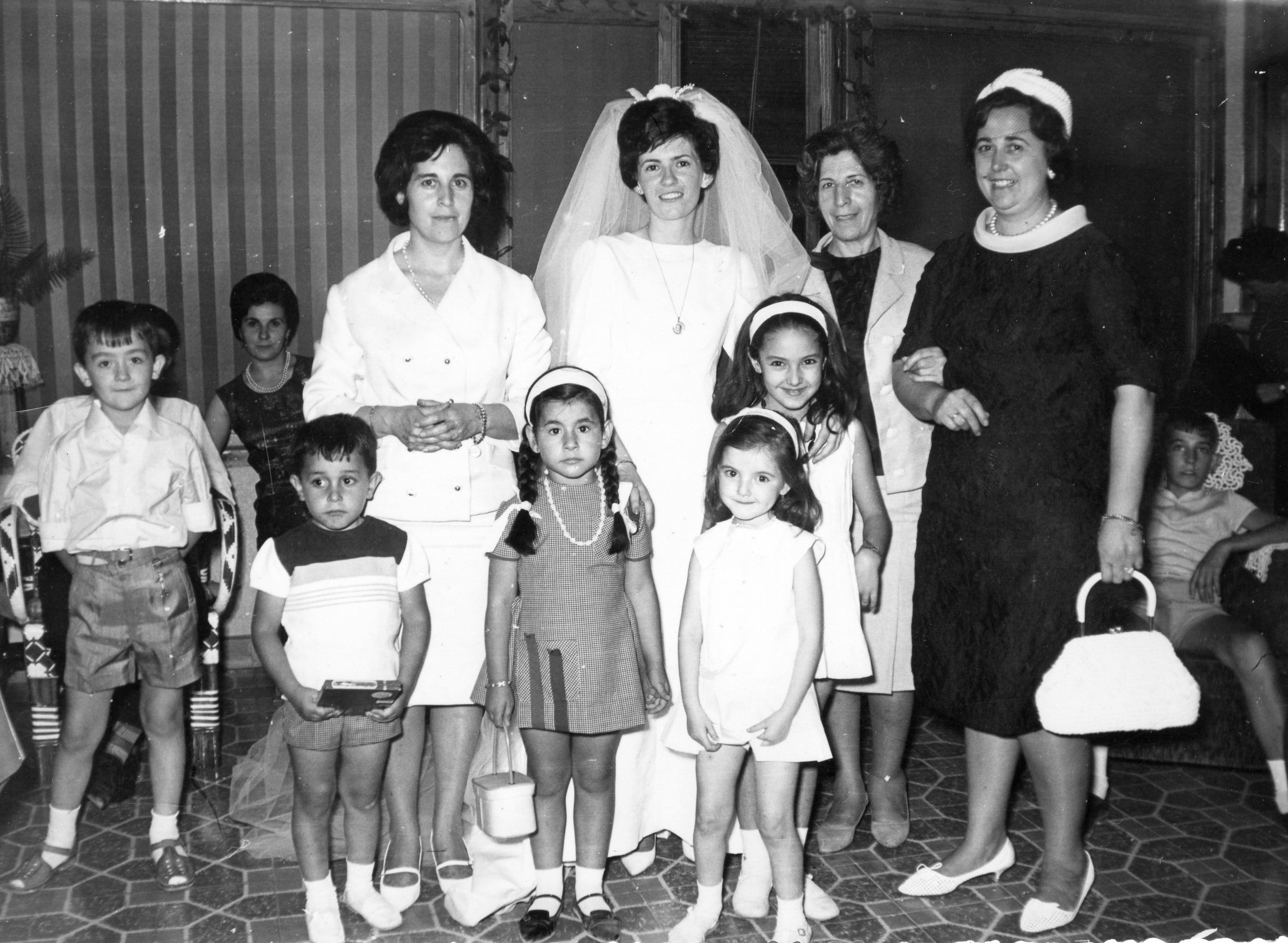 1965. Boda de Esthercita. De izquierda a derecha: Fernandito Negrillo, Angel Luis Arias,Laura Serrano,Eli Mari Molina, Esthercita Roncero, Maria Teresa Sánchez, Laurita Arias, Rosario Serrano y Mari Menchero.