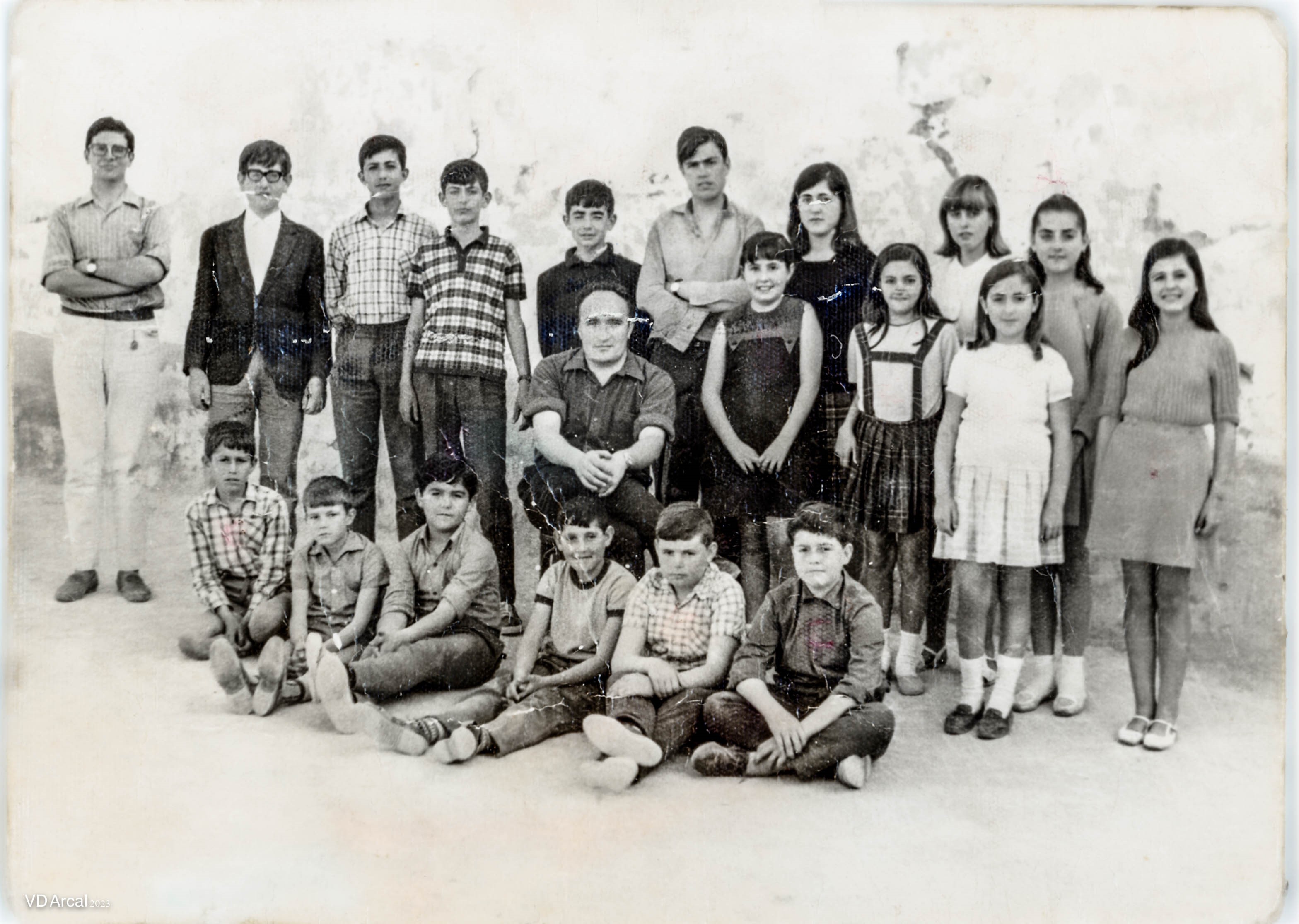 Ese pueblo , no tan distinto ni distante,-aunque si mucho más moderno-, del de hoy, es el que queríamos dibujar en nuestro libro. Ver las calles tranquilas, llenas de chiquillos, buscar un lugar donde unos maestros (un maestro y una maestra), con escasos medios, -muy escasos medios-, además de sus personas, pudieran iniciar, aunque muy brevemente, a un «montón» de niños, que junto a ellos se hicieron fotos (en nuestros de nuestros programas de paces fueron publicadas); niños calzados o descalzos, mal o bien vestidos, «repeinados» o mal pelados, de los cuales no sabemos el nombre (digo mal porque una de las hijas de esos maestros, Laurita Serrano Vázquez, le dió los datos suficientes a su hija Laura Arias Serrano, para que hoy, muchos de los que están en esa fotos, sea posible distinguirlos ) pero si que son parte de nuestros orígenes. Esa escuela fugaz y, a pesar de todo acogedora, para muchos de los niños , sería la indispensable academia de un poco mal leer o escribir, y a veces sólo dibujar la firma, y como no, de las necesarias «cuentas». Desde luego por no haber no había «ni monotonía de lluvia tras los cristales». (No deben quedar muchas fotos como la que adjuntamos a continuación pero se trata de las antiguas escuelas, derribadas para hacer el centro de salud y la Biblioteca. El árbol es uno de los de «pandesequillo» que estaban pegados a la valle de la escuela.)
