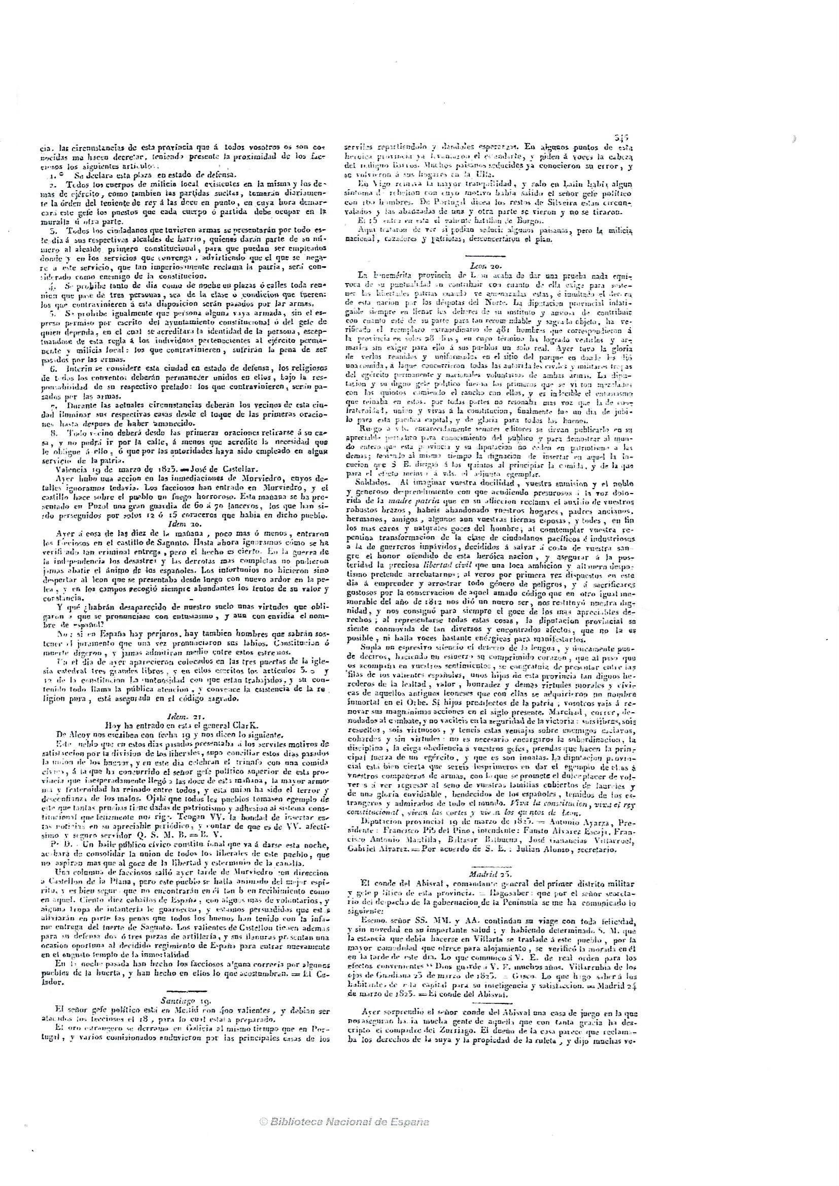 “Madrid 25. El Conde del Abisval, comandante general del primer distrito militar y gefe político de esta provincia = Hago saber que por el señor secretario del despacho de la gobernación de la Peninsula se me ha comunicado lo siguiente: Excmo. Señor SS.MM. y AA. continúan su viaje con toda felicidad, y sin novedad en su importante salud; y habiendo determinado S.M. que la estancia que debía hacerse en Villarta se traslade se traslade a este pueblo, por la mayor comodidad que ofrece para alojamiento, se verificó la morada en él en la tarde de este día. Lo que comunico a V.E. de real orden para los efectos convenientes. Dios guarde a V.E. muchos años. Villarrubia de los ojos de Guadiana, 23 de marzo de 1823= Gasco. Lo que hago saber a los habitantes de esta capital para su inteligencia y satisfacción = Madrid 24 de marzo de 1823= El conde del Abismal.” [EL ESPECTADOR.- Página 345, Nº 711 del miércoles 26 de marzo de 1823. Madrid (Copia digitalizada de la Biblioteca Nacional de España).]