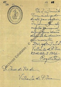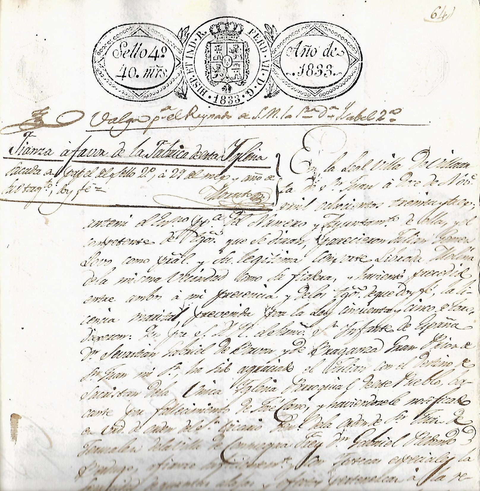La fianza citada anteriormente escrita en papel del sello 4º de 40 mrs. en el año 1833 con nota escrita para darle valor al papel del sello 4º «valga para el reynado de S.M. la Sª Dª Isabel 2ª«, dice lo siguiente: