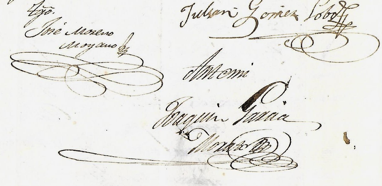 Firmas de la escritura, de izquierda a derecha y de arriba a abajo: José Moreno Moyano (testigo), Julián Gómez-Lobo (el Sacristan) y Joaquín García Morato (Escribano de Número y del Ayuntamiento) [Fuente: Protocolo de Instrumentos públicos otorgados ante el escribano Público Joaquín García Morato. Leal Villaarta Año 1833].