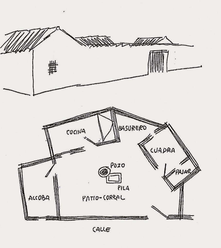 Sin embargo el que la cocina fuese el centro del hogar no quiere decir que la cocina estuviera en el centro de la casa. Para un lugar que era el centro y que por entonces casi todo lo que entraba en una casa tenía, casi siempre como último destino la cocina no podía estar situada sino en el sitio más cercano a ella de todas las cosas necesarias de la casa. En el dibujo que incorporábamos de D. Miguel Fisac, vemos que la cocina estaba abierta principalmente al patio y al corral y por tanto muy próxima y asequible al pozo y al basurero. Sino había el suficiente espacio para corral, en algún lugar del patio se recogía de la mejor manera posible la leña, en la mayoría de los casos gavillas de sarmientos que podían colocarse sin ocupar mucho espacio y sobre todo, si había suficientes podía cubrir parte del patio con una pequeña «tená» [Diccionario de la RAE. Cobertizo para el ganado aunque con más precisión, el citado diccionario habla de «tinada» como montón o hacina de leña y como acepción cobertizo para tener recogido el ganado como ovejas o cabras y por el que durante el día deambulaban picoteando sin parar gallinas y algún que otro gallo). Si había sitio suficiente en ese entorno se encontraba la porqueriza de los cerdos, bueno en la mayoría de las casas habría que hablar del cerdo que para más no daba la economía familiar. El acceso a este espacio casi siempre era directamente por la calle. Otras veces las casas solo tenían una entrada desde la calle por la cual se entraban las pequeñas caballerias de carga: los asnos o burros (en el lenguage coloquial los «borricos»). En muchas de las casas no había espacio suficiente para entrar un pequeño carro que a la vuelta del trabajo quedaba aparcado en la calle, vamos igual que ahora con los coches.