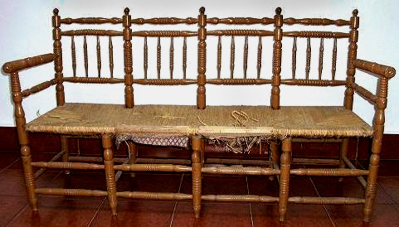 Una silla baja frente año para uso de su legítima dueña, mi abuela Josefa, hasta la hora en que llegaba mi padre del campo al que en invierno le dejaba el mejor sitio para calentarse. Frente a ella un pequeño fregadero y una banca, donde mi padre echaba una pequeña siesta. Curiosamente, en ese blog. de Campo Criptana del que antes hablaba, aparece una foto muy similar, aunque ya en muy malas condiciones, de la banca que recuerdo en mi casa.