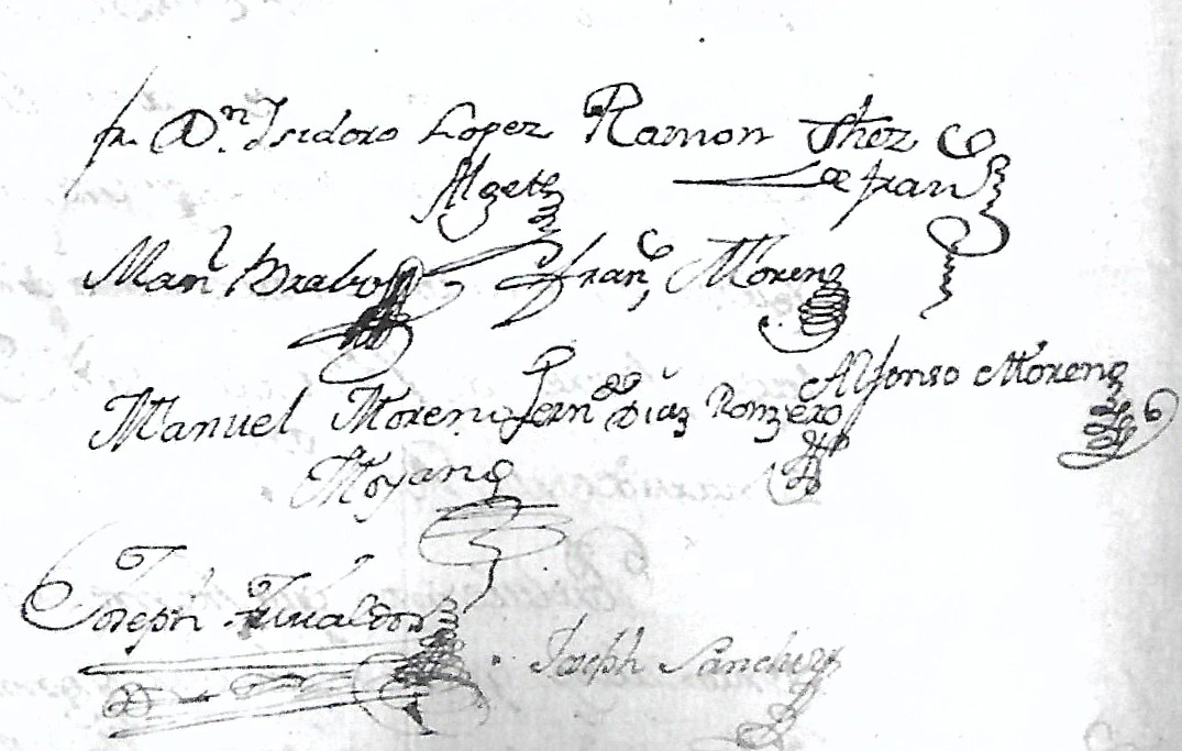 La divina guarde a V.A. Real en su mayor grandeza los muchos y felices años que puede y dicha villa y su vecindario le suplica . Villaharta de San Juan y mayo, 2 de 1778. A.L.R.P.de V.A. Frey Don Isidoro López Algete//Ramón Sánchez Cruz//Manuel Bravo//Francisco Moreno//Manuel Moreno Moyano//Fernando Díaz Roncero//Alfonso Moreno//Joseph Tribaldos// Joseph Sanchez Josef Antonio Aguirre, escribano del Número y Ayuntamiento de esta Villa de Villaharta por gracia de S.A.R. el Serenisimo Infante de España Don Gabriel Antonio, Gran Prior de San Juan, mi Señor doy fee: que los señores de quien va firmnada la representación de las tres hojas precedentes son Prior Párroco ; Alcaldes Ordinarios; Regidores, diputados y Procuradores síndico y personero de esta villa y las firmas que llevan puestas son suyas propias y las que acostubran en sus escritos para que conste y efectos convenientes de mandato de dichos señores doy el presente que signo y firmo en la expresada villa a dos de mayo de mil setecientos setenta y ocho. [A.G.P. SECRETARIA. VILLARTA. Legajo 293. 2 de mayo 1778]