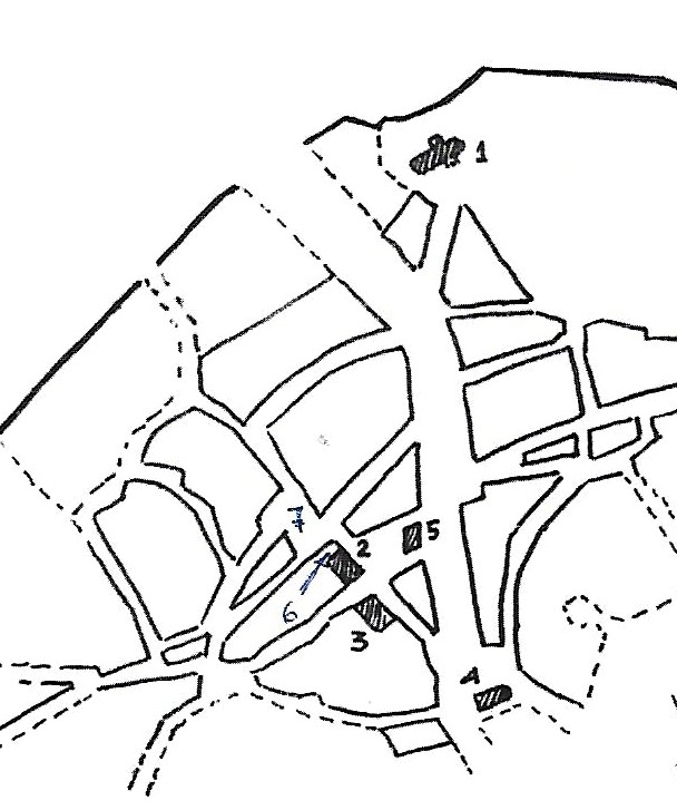 Plano de Villarta de San Juan en el año 1769. 1. Iglesia parroquial 2. Ayuntamiento 3. Casa de la Tercia 4. Ubicación de la antigua ermita de Nª sª de la Paz 5. Pósito Municipal 6. Torre del Reloj 7. Plaza actual del Altillo (Elaboración Propia)