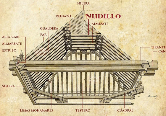 En cualquier caso lo que si parece estructura de la época que estamos analizando es el enmaderado del tejado, aunque la foto sea muy reciente, no hay constancia de obras recientes que hayan afectado a esta estructura. Es posible que ese enmaderado pueda ser identificado por alguno de los tipos concretos que se expresan en el documento.