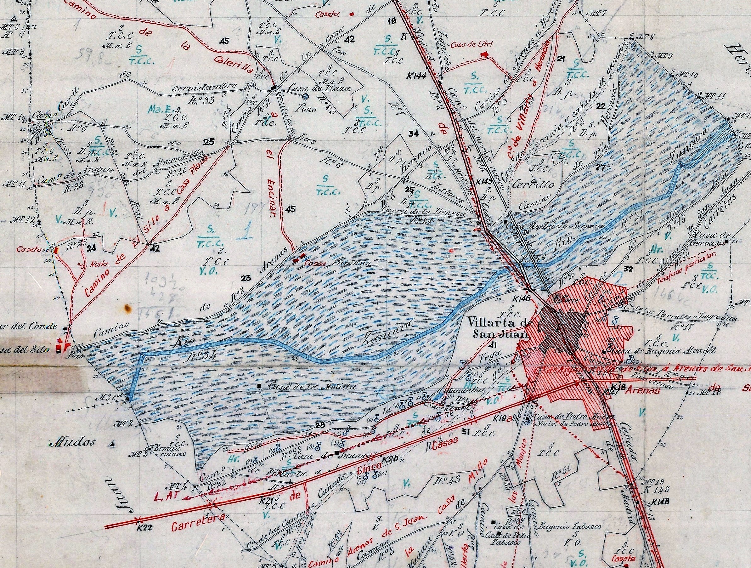 Trabajos topográficos. Provincia de Ciudad Real. Región de Alcázar de San Juan. Término Municipal de Villarta de San Juan. En él en diversos colores se aprecian todas las variaciones topográficas hasta 1965, por el Instituto Geográfico y Estadísitico. En negrita, se observa el camino viejo de Puerto Lápice, desde el cual ( a la altura de la casa de litri) arranca en linea recta hasta la población de Villarta el Camino del Puente Nuevo. Se aprecia, igualmente, en negrita, el puente viejo o romano y de punta a punta del mismo, en rojo se señaliza el trazado de la nueva carretera realizado ( el diseño) en 1923 por el topógrafo Luis Fernández.