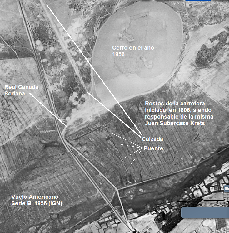 Fotografía aéreas del vuelo americano de 1956. De izquierda a derecha: Puente de la N-IV, puente romano y resto del puente sin terminar de Subercase. De este último ha desaparecido la calzada de tierra, tras las obras de la Autovia A-4 y se mantienen los arcos del puente tal y como quedaron, sin terminar, en 1808. (Fuente IGN)