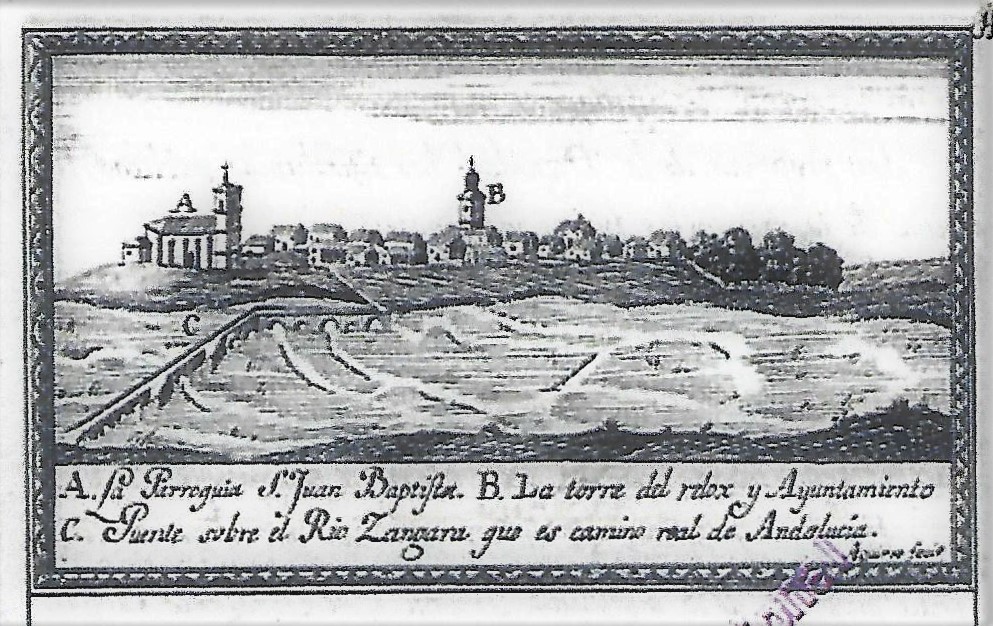 Gráfico de Villarta de San Juan (Aguirre fecit) en 1769 (La silueta del puente de entonces y el de ahora no parfecen ser muy distintas.