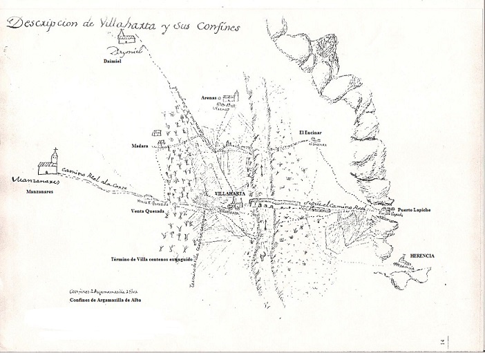 FRANCISCO SANCHEZ ( Vecino de Villarta de San Juan) Edad de 52 años, casado con María Muñoz, de cuarenta y ocho años. Hijos: Francisco (13 años) y Ramón (9 años). Criados a su cargo: Isidro López (Mayoral de 27 años), José Infante ( Zagal de 24 años), Francisco de Úbeda (Zagal de 18 años ) y Antonio de Riva ( Criada de 18 años) POSESIONES: TIERRAS: 34 fanegas de tierra de mediana Calidad para trigo en el sitio de Villacentenos a media legua de Villarta de San Juan. Linderos: L. Carril de Mejia; a P. Camino de Manzanares; al N. Joseph Sánchez y al S. Juan Bravo. (Se calcula su renta en 780 reales al año). 29 fanegas de inferior calidad. Sitio de Villacentenos. Linderos: L. Patricio Onrrado; a P. Camino de Lugar nuevo; al N. con lo liego y al S. Camino de las Carretas ( Se calcula su renta en 647 reales y 22 mrs. al año); 17 fanegas de mediana calidad en Villacentenos. Dista medio cuarto de legua. Linderos: a L. Francisco Paulete; a P. con Joseph Sánchez, el menor; al S. el dicho Paulete; al N. con el dicho Paulete y a S. Francisco Romero ( Se calcula su renta en 765 reales anuales); 18 fanegas de mediana calidad en Villacentenos . A media legua. Linderos L. Juan Duqueso; a P. casa del Monte, al N. carril de la casa de Falcón y al S. Carril de las Carretas (Se calcula su renta anual en 810 reales). VIÑAS: 7 Fanegas con 7.OOO vides. Medio cuarto de legua. Linderos: a L. Nicolás Muñoz; a P. Camino de Lugar Nuevo; a N. Manuel Rojo y al S. con Gregorio Muñoz ( Se calcula su renta en 1500 reales anuales); 1 fanega y dos celemines. Confronta con la anterior. 1200 vides. Linderos: a L. Camino que va a la Heredad; a P. Joseph Sánchez; a N. Camino a la Heredad; a S. Diego Sánchez (Se calcula su renta en 280 reales anuales)