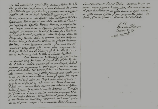 Pero vecinos de Villarta ¿y no tendre para vosotros una bendición que daros? Si: El Dios de la Paz que desde oi habita corporalmente en este templo habite también por su gracia en vuestras casas, y en vuestros corazones. La bendición del eterno Padre se derrame sobre todos vosotros, sobre mi, y sobre quantos han tenido parte en esta obra. La bendición santa que ayer hizo vajarel fuego del cielo sobre este templo material, abrase y purifique el templo de vuestros corazones. Arded como ardía el corazón de un franco de Asis, que embriagado con aquel divino manjar se arrebataba por los aires; arded como ardía el corazón de un Carlos Borromeo, que no hallaba La bendición santa que ayer hizo vajar el fuego del cielo sobre este templo material, abrase y purifique el templo de vuestros corazones. Divino Precursor que desde esa elevación donde presides nos señalas al cordero de Dios que quita los pecados del mundo, francisco de Asis, Carlos Borromeo que vais a ser los centinelas perpetuos del lecho del mejor Salomon, interced con el para que asegure a este pueblo las eternas y temporales bendiciones, y alexe de el para siempre las amenazas. Divino Precursos,[19] Juan Bautista, vos que soi titular, el Protector de esta informe imagen o figura de Jerusalen, sedlo mas eficazmente para introducirnos en aquella santa, en aquella nueva, en aquella eterna y feliz que esta preparada para los justos , que es la Gloria. Amem. O.S.C.S.R.C. Fray Juan Antonio Corleon.[Fuente: AGP. IDG Secretaría Leg. 294]