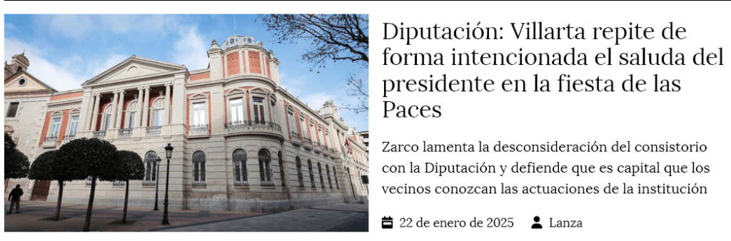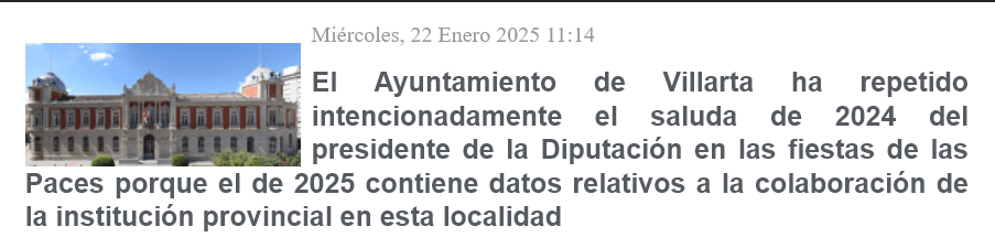 El anterior pantallazo de Lanza, correspondiente al día 22 de enero aparece un largo y explicativo escrito procedente de la Diputación que el propio Lanza ha resumido en el primer párrafo de la información: «El Ayuntamiento de Villarta de San Juan ha incluido en el programa de fiestas de las Paces 2025 el saluda institucional del presidente de la Diputación de Ciudad Real, Miguel Angel Valverde Menchero, correspondiente a la edición de 2024, en lugar del mensaje oficial de este año. Este hecho ha generado una situación inusual que pone en cuestión la coordinación que debe existir entre instituciones y el mensaje que las autoridades dirigen a la ciudadania». [Ante esta publicación que llega a mis manos a través de la propia página del diario en Internet, solo cabían dos recursos. Uno el más fácil y que a la larga -muy a la larga- es el que mejor resultados da: callarse y cerrar página; el otro recurso era utilizar un nuevo poyete -como estoy haciendo- para de alguna forma aclarar esa afirmación de que Villarta (Villarta de San Juan) -en cualquier caso no sería Villarta de San Juan, sino el consistorios de Villarta de San Juan si lo que se quiere es entrar en el enfrentamiento político- repite de forma intencionada la publicación del saluda de las paces del 2024, como saluda del 2005. Me pareció mejor esta última solución y en ello estamos.] En primer lugar, aunque ya hemos indicado algo en el preámbulo para definir mas, claramente, algunas observaciones que se dicen en la entradillas del Lanza. Se habla de saluda institucional y poco después, habla de mensaje oficial cuando se refiere a los saludas. En realidad los saludas son escritos que cumplimentan la petición de unas palabras, por parte del Ayuntamiento, al Presiente de la Diputación, para el programa de festejos.