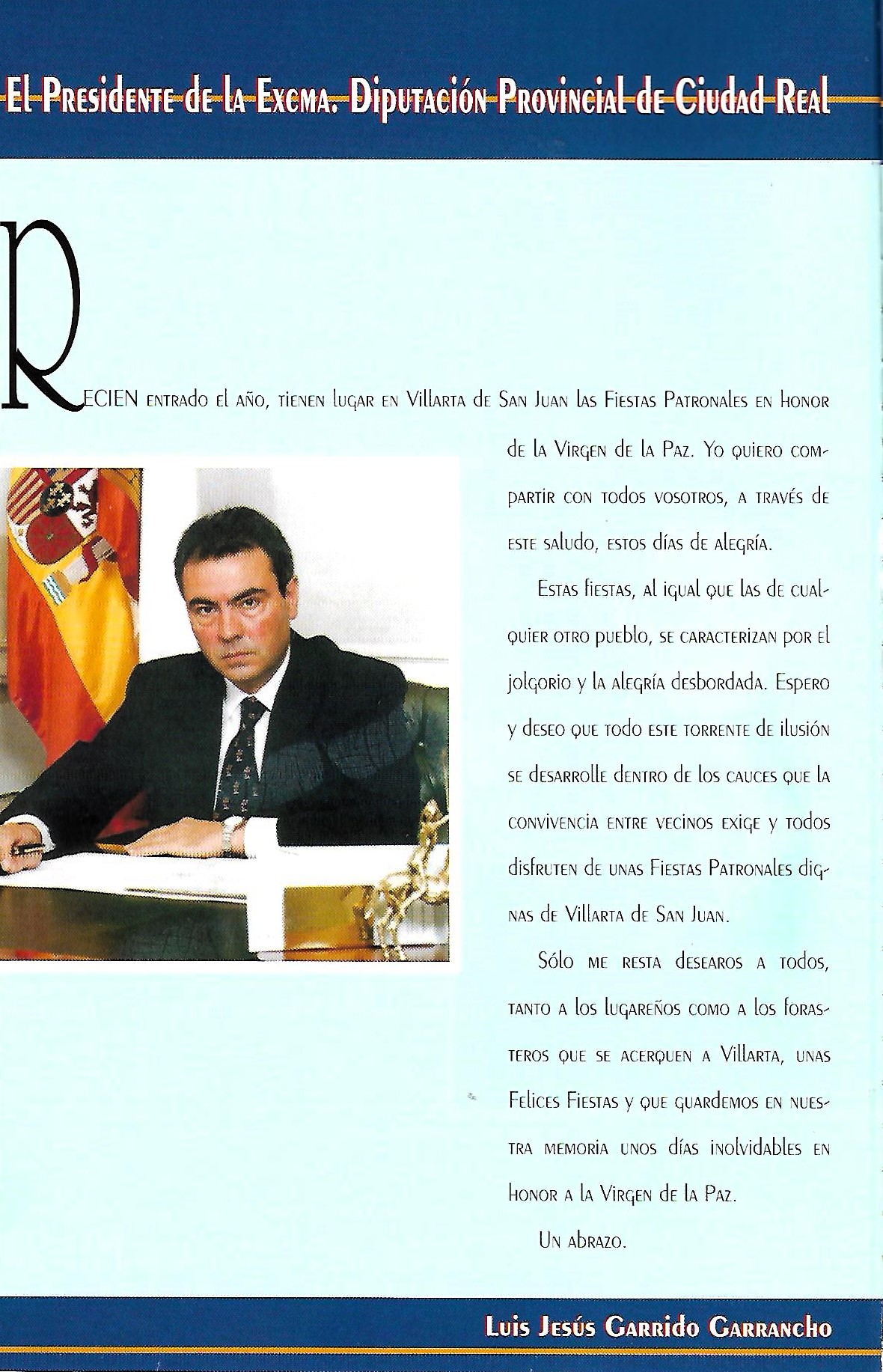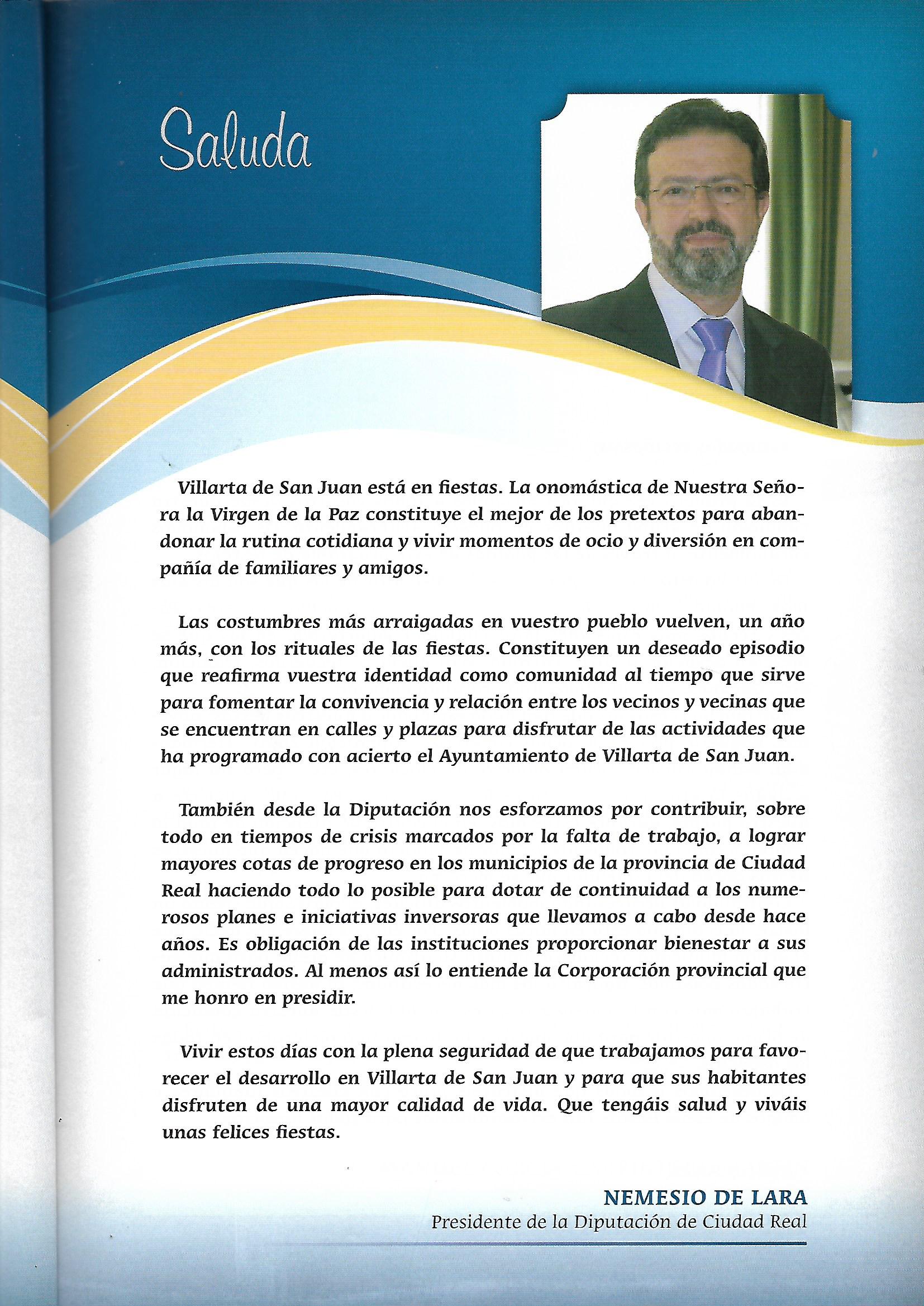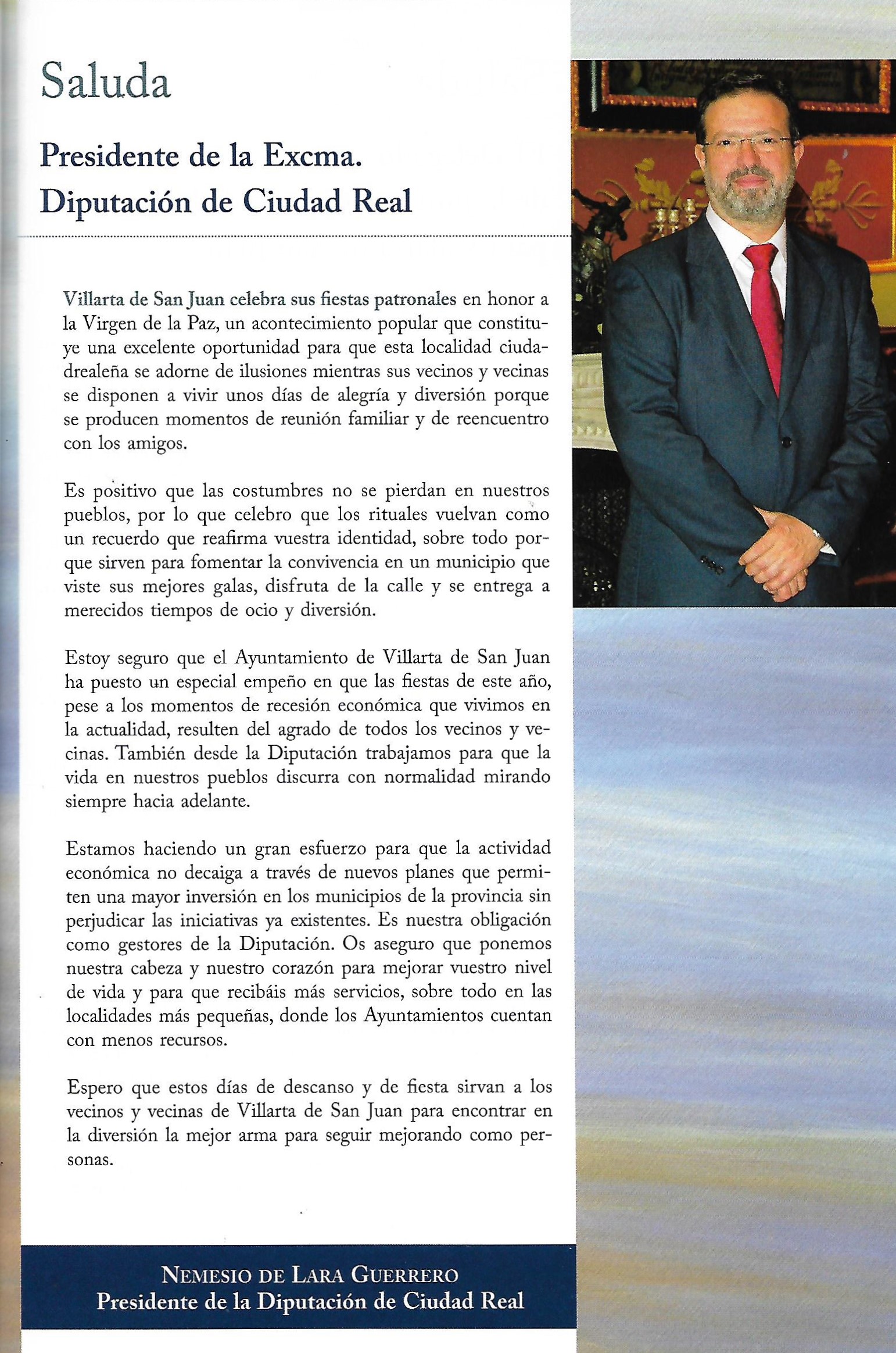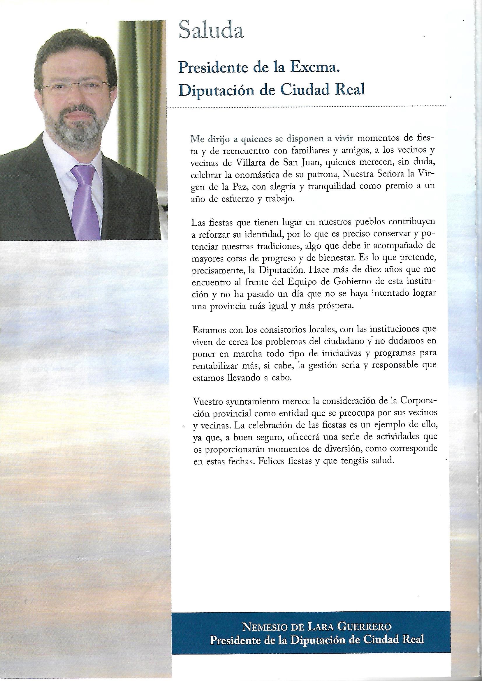 José María Barreda Fontes, desde 2005 a 2011 fué Presidente de Castilla-La Mancha. En su primer saluda decía, entre otras cosas:»…No obstante quiero aprovechar este espacio que generosamente me ofrecéis para compartir con vosotros estos días de alegria. Por lo que represento como Presidente de Castilla-La Mancha, quiero reafirmar el compromiso del Gobierno Regional con los vecinos y vecinas de Villarta de San Juan. Villarta de San Juan es un municipio que progresa día a día y que sin alejar la vista de su historia tampoco quiere perder el tren hacia el progreso y el bienestar. Se han realizado muchas cosas gracias al esfuerzo de todos y todas, pero todavía queda mucho por hacer, y para alcanzarlas en Villarta de San Juan nos tendréis a vuestra entera disposición porque juntos alcanzaremos mas y mejores metas. Gracias por hacernos partícipes de estas fiestas de la Virgen de la Paz. Que el entusiasmo inunde vuestras calles y plazas. Recibid un saludo.» [JOSE MARÍA BARREDA FONTES. PROGRAMA DE FESTEJOS 2005. SALUDA EL PRESIDENTE DE CASTILLA LA- MANCHA.]