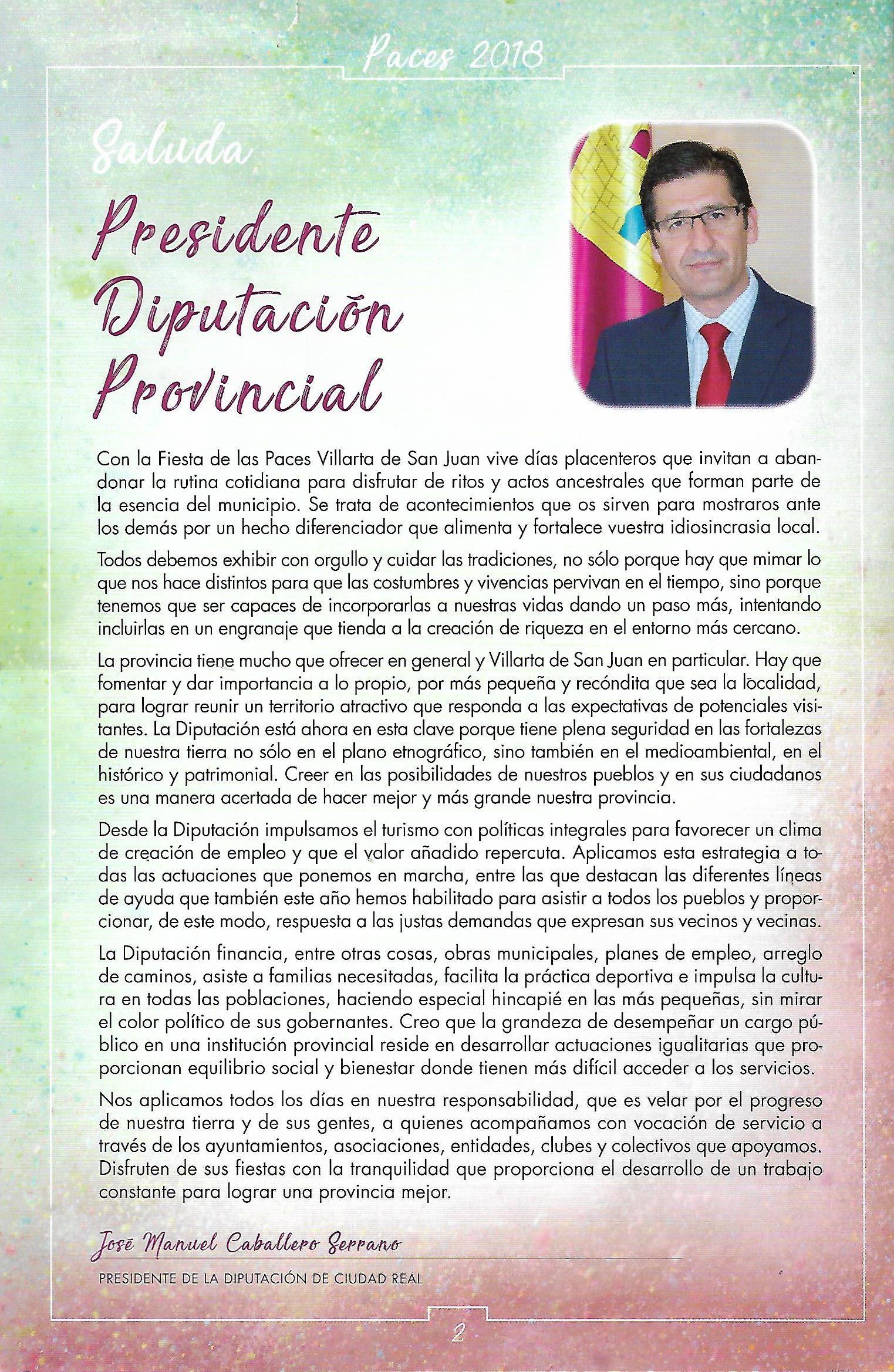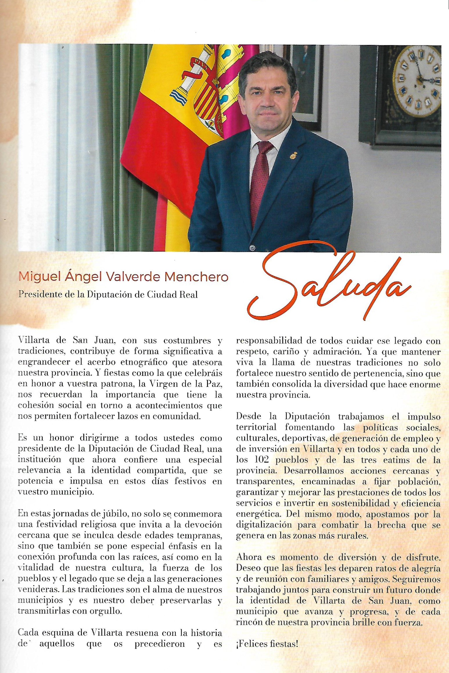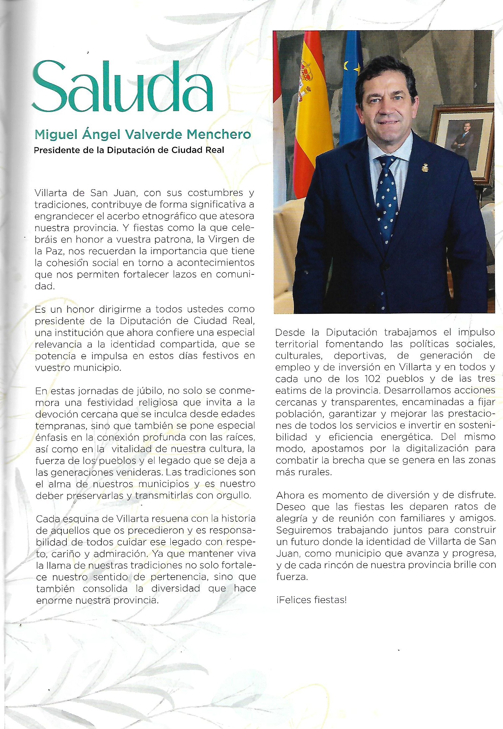 En todos estos saludas de los Presidentes de la Diputación la principal norma por parte de todos los presidentes al igual que los demás saludas de autoridades u órganos oficiales era el de recalcar la importancia de las tradiciones de nuestros pueblos. Decía el actual Presidente de la Diputación, Miguel Angel Valverde Menchero: «y fiestas como las que celebráis en honor a vuestra patrona la Virgen de la Paz… es un honor dirigirme a todos ustedes como presidente de la Diputación de Ciudad Real, una institución que ahora confiere una especial relevancia a la identidad compartida que se potencia e impulsa en estos día festivos en vuestro municipio». Incluso como el resto de Presidentes en sus Saludas habla del apoyo de la diputación a todos los pueblos de nuestra provincia, «desarrollamos acciones cercanas y transparentes» para nuestra provincia. Y terminaba este saluda como todos: «Ahora es momento de diversión y de disfrute. Deseo que las fiestas les deparen ratos de alegría y de reunión con familiares y amigos. Seguiremos trabajando juntos para construir un futuro donde la identidad de Villarta de San Juan, como municipio que avanza y progresa, y de cada rincón de nuestra provincia brille con fuerza.» o incluso marcando las lineas generales, por parte de la Diputación, en referencia al apoyo y cooperación con todos los ayuntamientos: «..Desde la Diputación trabajamos el impulso territorial fomentando las políticas sociales, culturales, deportivas, de generación de empleo y de inversión en Villarta y en todos y en cada uno de los 102 pueblos y de las tres eatins..» [LO SUBRAYADO EN AZUL ES COPIA LITERAL DE FRAGMENTOS DEL SALUDA DEL PRESIDENTE DE LA DIPUTACIÓN, MIGUEL ANGEL VALVERDE MENCHERO EN 2024. PROGRAMA DE FESTEJOS DE 2024].