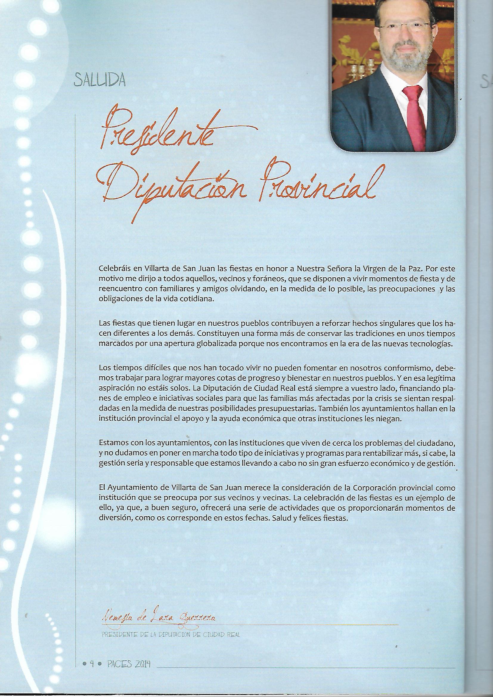 En todos estos saludas de los Presidentes de la Diputación la principal norma por parte de todos los presidentes al igual que los demás saludas de autoridades u órganos oficiales era el de recalcar la importancia de las tradiciones de nuestros pueblos. Decía el actual Presidente de la Diputación, Miguel Angel Valverde Menchero: «y fiestas como las que celebráis en honor a vuestra patrona la Virgen de la Paz… es un honor dirigirme a todos ustedes como presidente de la Diputación de Ciudad Real, una institución que ahora confiere una especial relevancia a la identidad compartida que se potencia e impulsa en estos día festivos en vuestro municipio». Incluso como el resto de Presidentes en sus Saludas habla del apoyo de la diputación a todos los pueblos de nuestra provincia, «desarrollamos acciones cercanas y transparentes» para nuestra provincia. Y terminaba este saluda como todos: «Ahora es momento de diversión y de disfrute. Deseo que las fiestas les deparen ratos de alegría y de reunión con familiares y amigos. Seguiremos trabajando juntos para construir un futuro donde la identidad de Villarta de San Juan, como municipio que avanza y progresa, y de cada rincón de nuestra provincia brille con fuerza.» o incluso marcando las lineas generales, por parte de la Diputación, en referencia al apoyo y cooperación con todos los ayuntamientos: «..Desde la Diputación trabajamos el impulso territorial fomentando las políticas sociales, culturales, deportivas, de generación de empleo y de inversión en Villarta y en todos y en cada uno de los 102 pueblos y de las tres eatins..» [LO SUBRAYADO EN AZUL ES COPIA LITERAL DE FRAGMENTOS DEL SALUDA DEL PRESIDENTE DE LA DIPUTACIÓN, MIGUEL ANGEL VALVERDE MENCHERO EN 2024. PROGRAMA DE FESTEJOS DE 2024].