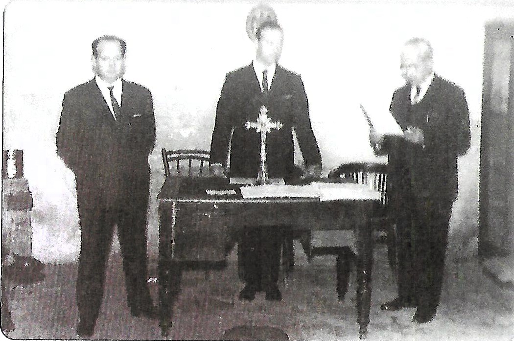 Toma de posesión del Alcalde Cayetano Garrido, ante el secretario en funciones, Juan Antonio Rodriguez y Pablo Fernández, uno de los concejales. (Fuente: Villarta de San Juan. Historia de un pueblo y su gente.)