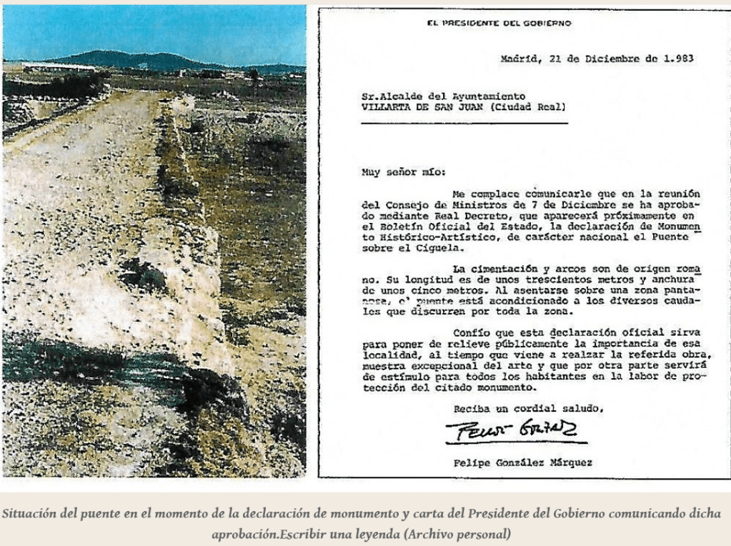 El 24 de abril de 1981, el ayuntamiento de Villarta de San Juan nos encargó la elaboración de un informe que se remitió a la Comisión Provincial de Monumentos a fin de instruir expediente de monumentalidad sobre el puente sobre el Puente Viejo. El 21 de diciembre de 1983 se recibió la comunicación del Presidente de Gobierno que anteriormente hemos incluido. Posteriormente en el BOE.- Núm. 38 de 14 de febrero de 1984 se publicó el siguiente: