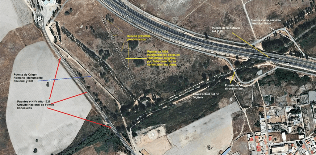 Pero cuando las cosas dejan de tener el valor que tuvieron, cuando ya no hacía falta puente alguno para cruzar el río Gigüela (salvo alguna que otra excepción), el puente fue decayendo. Uno de esos años, aproximadamente por el 1926 se puso en movimiento la construcción del Circuito Nacional de Firmes Especiales (una red de carreteras radiales inicio de las actuales por el Gobierno de la Dictadura de Miguel Primo de Rivera). En ese Circuito construyó un nuevo puente y calzada, al poniente del puente viejo y va a hacer 100 años o ya los ha hecho que el puente viejo dejó de ser útil para nuestro pueblo (No tenemos certeza de las fechas porque consultado el Ministerio de Fomento nos comunicaron que no había datos del arquitecto pero si que estaba dentro del plan de carreteras del Ciruito Nacional de Firmes Especiales). En cualquier caso en el siguiente mapa y señalado en rojo solamente aparecen señaladas las localidades, (en la provincia de Ciudad Real) de Puerto Lápice, Manzanares y Valdepeñas