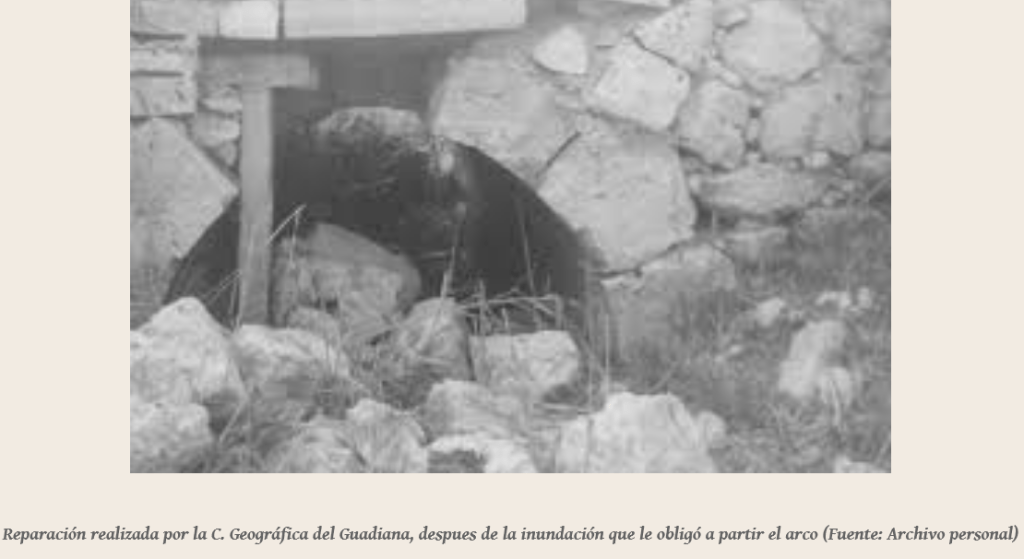 En la década de los setenta del siglo pasado, las grandes inundaciones del río Gigüela motivaron que la C.H. del Guadiana, para evitar más daños que afectaban a los campos de cultivo ( y de forma inadecuada) procedió al corte del puente por uno de sus últimos arcos al norte. Pasadas estas inundaciones, y ante el riesgo que podía suponer para el puente se reparó dicho corte de la forma grosera y poco analizada de la misma. Los técnicos de la C.Hidrográfica del Guadiana y nuestro puente, en gran parte de su longitud quedó durante algún tiempo de la forma que se aprecia en la anterior fotografía, incluida la ¿reparación? del ojo.