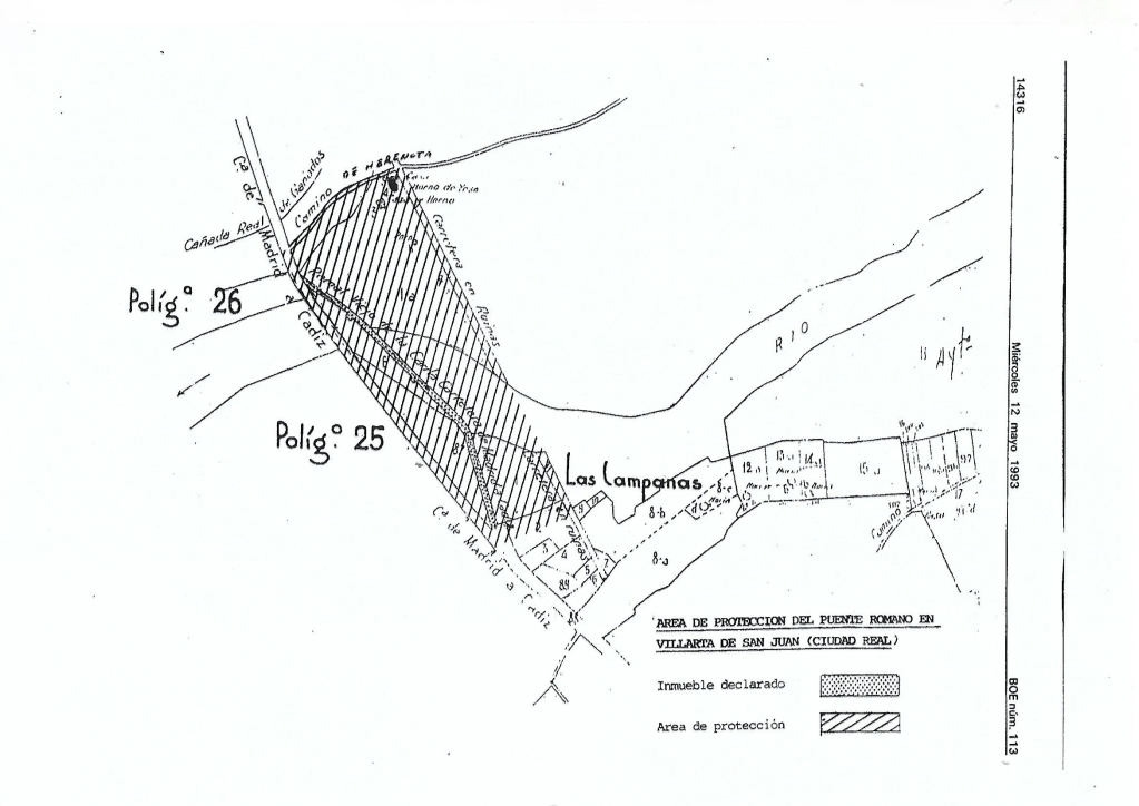 Artículo único el Area de Protección del monumento denominado Puente Medieval sobre el Río Cigüela antiguamente conocido como «Puente Romano» y situado en Villarta de San Juan (Ciudad Real) queda delimitado conforme al anexo del presente Decreto. Dado en Toledo a 7 de junio de 1994.