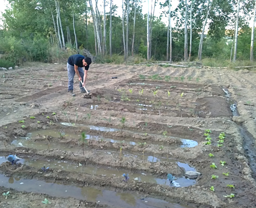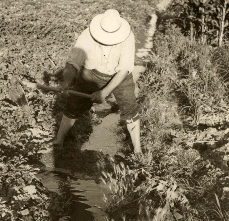 Hortelano abriendo una de las boquillas de la reguera.